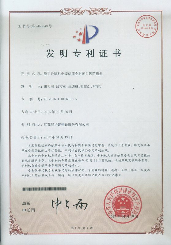 我公司又获得一项国家发明专利授权 时间:2017-06-02 3877 日前,公司又一项发明专利获得国家知识产权局授权,此项专利名称为“施工升降机电缆储筒全封闭自锁防盗器”,专利号为ZL 2016 1 0106133.6。 至此,公司已有22项发明专利入账。