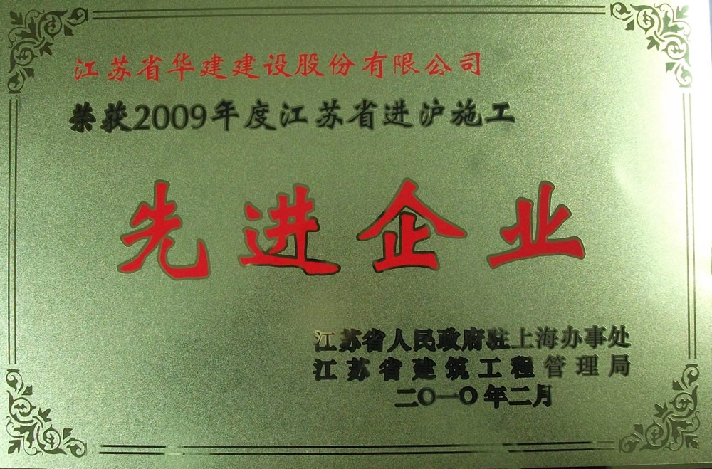 公司七获“江苏省进沪施工先进企业”称号 时间:2010-03-29 6235 3月10日,在江苏省政府驻沪办、江苏省建管局召开的2009年度江苏进沪施工总结表彰暨迎世博动员大会上,江苏华建被表彰为“江苏省进沪施工先进企业”,这已是第七次获次殊荣;表彰会上, 上海洛克外滩源总承包项目部、中船临港二期加工综合楼项目部被评为优秀项目部,另有3人被评为优秀项目经理,各有1人被评为安全管理先进个人、质量管理先进个人、经营管理先进个人、财务管理先进个人,有2人被评为绿色施工管理先进个人。
