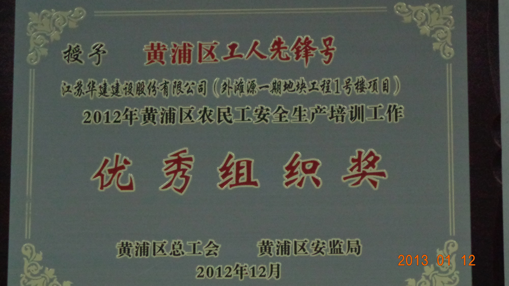 上海洛克外滩源一期被授予“黄浦区工人先锋号” 时间:2013-01-12 6314 日前,在上海黄浦区总工会、黄浦区安监局联合组织的“工人先锋号”评比中,由我公司组建的上海洛克外举滩源一期被授予黄浦区工人先锋号,同时还被授予2012黄浦区农民工安全生产培训工作优秀组织奖,周群利同志被评为2012年黄浦区农民工安全生产培训工作先进个人。