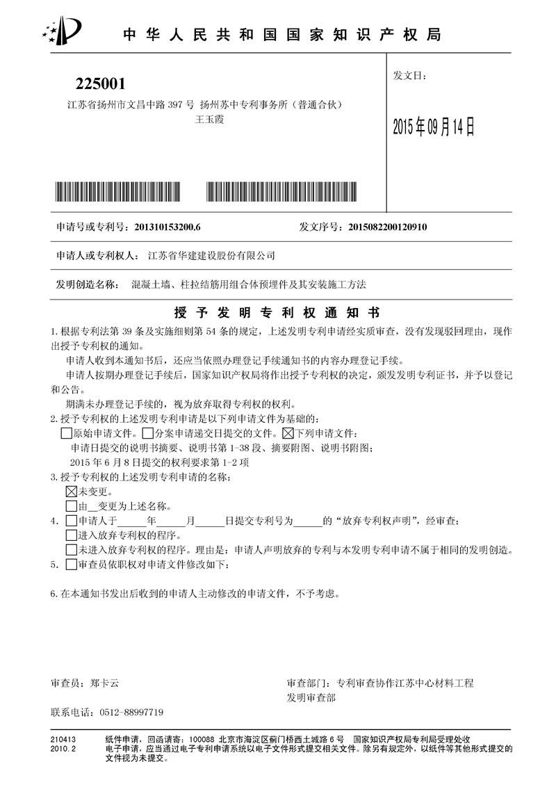 公司获一项发明专利 时间:2015-09-15 5485 日前,江苏华建上海区域公司发布的《混凝土墙、柱拉结筋用组合体预埋件及其安装施工方法》发明创造被国家知识产权局授予“发明专利权”,专利号:201310153200.6。