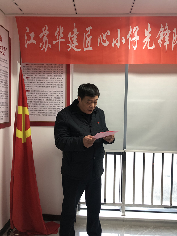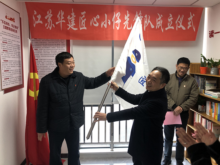 成立仪式上,在所有队员高唱国歌之后,钱启明代表总部党委向江苏华建匠心小仔先锋队的成立表示热烈祝贺,并向先锋队队长庄重授旗。他结合当前形势任务提出三点要求:一是要抓基础强“根”固“魂”。要以“五聚焦五落实”为主要抓手,坚持不懈攻弱项补短板、抓基层打基础,推动党组织领导更加坚强、企业党建工作体制机制更加完善、党的组织覆盖和工作覆盖更加全面、党支部建设更加规范、党员教育管理更加有效、党建与生产经营融合更加紧密,全面提高基层党组织建设和党员教育管理工作质量,为推动企业高质量发展提供坚强组织保证。二是要创特色发挥作用。要把匠人匠心的智慧和党的初心使命有机融合,通过开展丰富多彩的活动,引领广大党员、团员和骨干人才,在工作、学习、生活方面发挥先锋模范作用,在“危、急、重、难”任务面前挺身而出,真正体现出先锋队的作用,创建一支想干事、能干事、干成事的优秀团队,创出新时代企业党建工作的新特色。三是要强本领担当奉献。作为国有企业,必须打造一支忠诚干净担当的高素质干部队伍,全面锤炼提升“八个本领”,尤其要强化廉政建设,严格遵守党规党纪,更加注重提高政治本领、斗争本领,维护好干事创业、风清气正的政治生态。他希望江苏华建匠心小仔先锋队能够创成响当当的特色党建品牌,以习近平新时代中国特色社会主义思想为指导,进一步提高政治站位,增强担当奉献意识,为人民幸福、民族复兴和企业发展作出更大贡献。