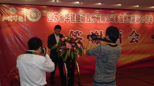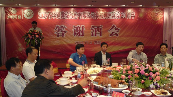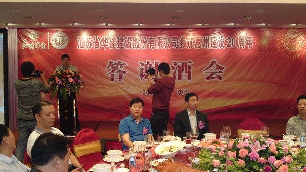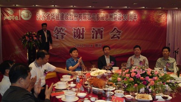 11月4日,公司在惠州凯宾斯基酒店王子饭店隆重召开参加惠州建设20周年庆典暨答谢酒会,公司副董事长、总经理宗有农主持酒会并作开场致辞。惠州市有关政府部门、部分合作方企业的负责人,华建联盟成员单位负责人,公司董事、监事和高管等130余人出席庆典。惠州公司总经理华恒荣介绍了公司参加惠州建设20年的有关情况。惠州市工商联主席、公司战略合作伙伴恒宇实业集团公司董事长杨满芳代表合作方发言,惠州市住房和城乡规划建设局副局长陈训政代表政府主管部门致辞,分别对江苏华建进驻惠州施工、参加惠州建设20周年表示祝贺。公司董事长陆金龙代表公司总部对惠州市有关政府部门、相关合作方和社会各界人士给予公司的关心和支持表示诚挚的感谢,并表达了进一步加大支持力度、加强战略合作、加快科学发展的意愿。
