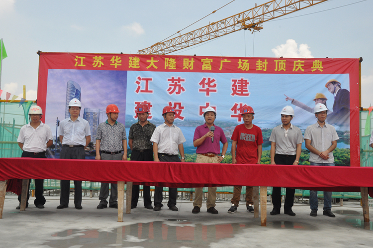大隆企业集团董事长李坤对该工程封顶表示热烈祝贺,同时对江苏华建前阶段工作作了充分肯定,对现场工程质量、安全生产、文明施工管理、目前施工进度非常满意。江苏华建机具设备处技术负责人张武军在发言中表示:封顶只是取得阶段性成果,下阶段江苏华建将继续秉承“追求卓越,铸造精品”的一贯理念,发扬精益求精、一丝不苟的工作作风,切实组织好下阶段的施工,为社会、为业主奉献精品。