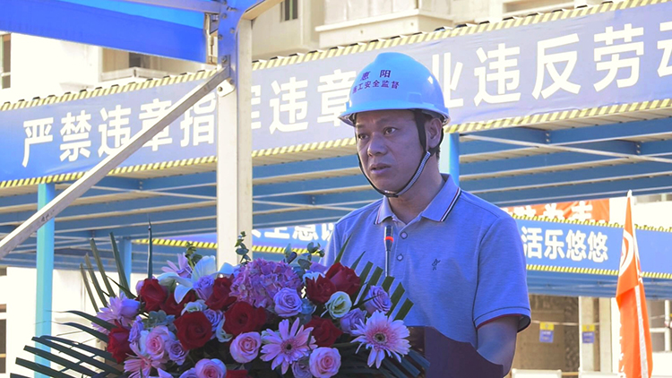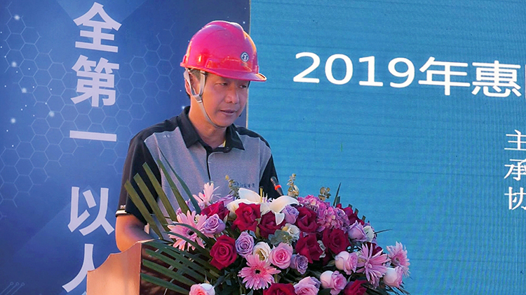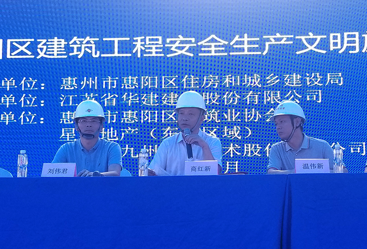 惠州市住房和城乡建设局副局长商红新最后讲话,他高度赞扬江苏华建在工程施工中的安全管理、文明施工水平,并希望项目继续保持良好势头,一如既往地注重安全、抓好质量、保证进度,圆满完成工程任务。对于当前安全生产工作,他提出三点意见:一是各企业要强化底线思维和红线意识,把安全生产工作抓实抓细抓到位;二是紧扣安全生产月主题,始终以敬畏之心对待安全生产工作,落实责任,严格履职尽责;三是以安全生产月为契机,牢牢把好安全培训教育关口,真正提高从业人员的安全知识、安全意识、安全技能和应对各类突发事件的处置能力。