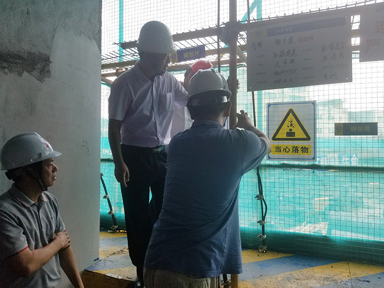 图为商局听取温局和惠阳区施工安全监督站陈永祥站长介绍脚手架安全网内侧张挂“钢丝网”防护情况
