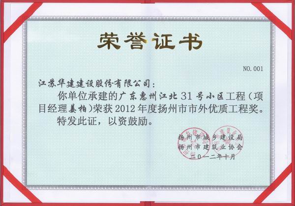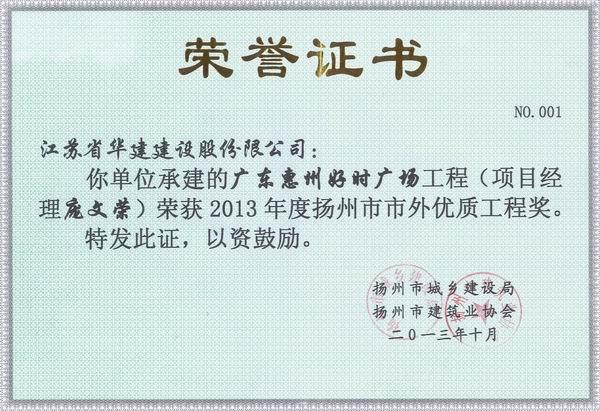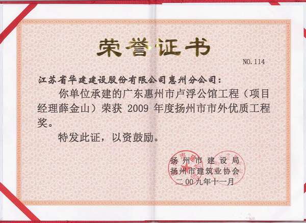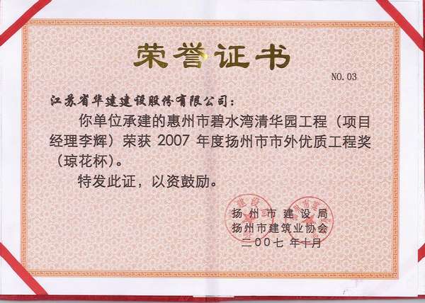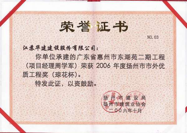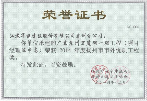 优质工程奖项 时间:2011-03-10 6760 2015年扬州市市外优质工程奖 2014年度市外琼花杯-广东惠州万麓湖一期 2013年度市外琼花杯-广东惠州好时广场 2013年度市外琼花杯-广东惠州江北31号小区 2009年度市外琼花杯-卢浮公馆 2008年度市外琼花杯-东湖花园七区 2007年度市外琼花杯-隆生商业大厦 2007年度市外琼花杯-碧水湾清华园 2006年度市外琼花杯-东湖苑二期