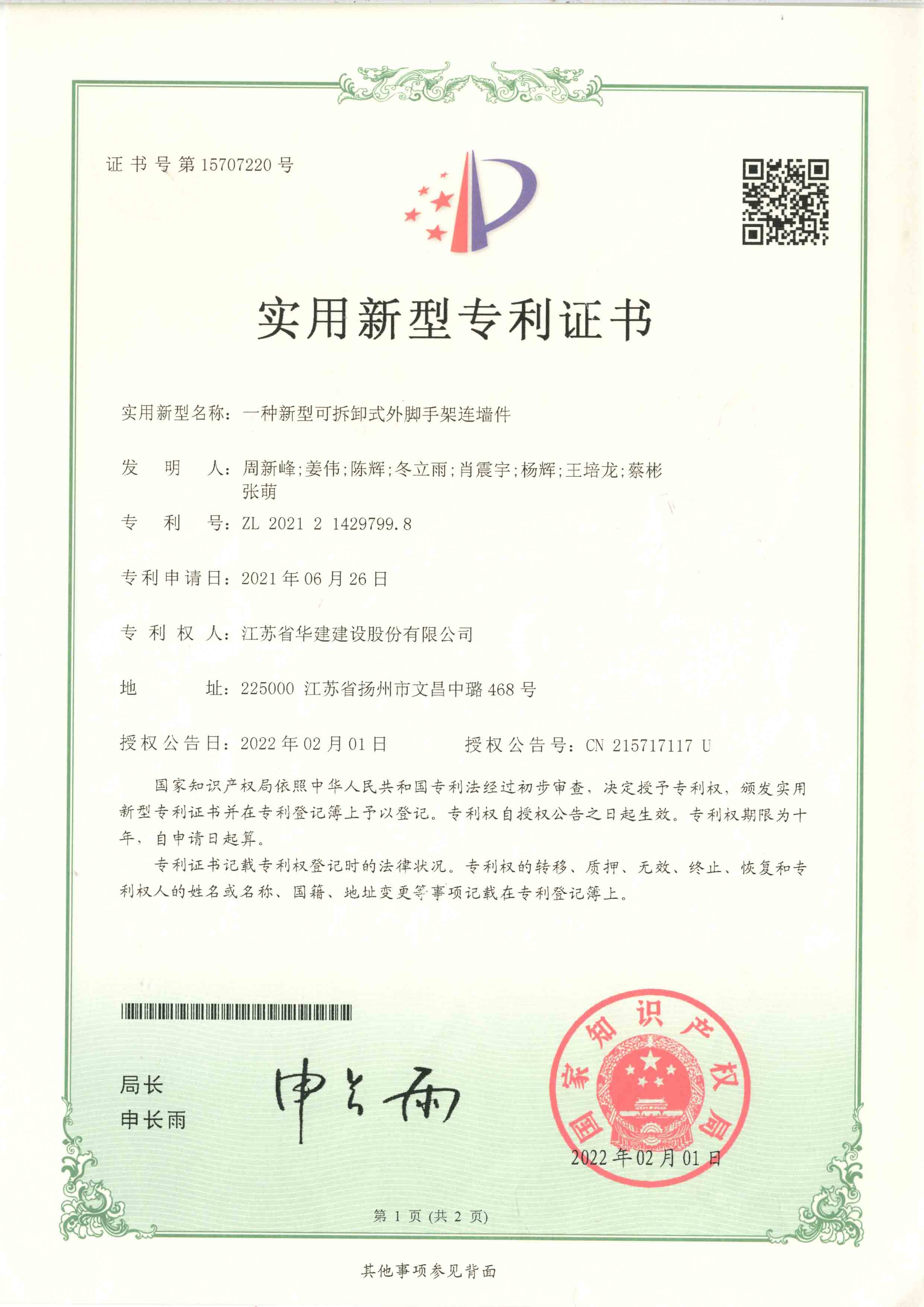 北京分公司2022年度已取得两项实用新型专利证书 时间:2022-08-22 3565 日前,国家知识产权局颁发了实用新型专利证书,公司两项专利取得实用新型专利证书,分别是:一种新型可拆卸式外脚手架连墙件、一种钢筋混凝土现浇板板厚高精度控制装置。