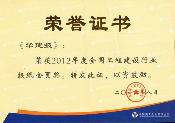 《华建报》连续三年荣获“金页奖” 时间:2012-08-14 4251 8月9日,中施企协发布《关于表彰2012年度全国工程建设行业“金页”报刊和“银页”报刊的决定》,公司主办的《华建报》连续第三年被评为全国工程建设行业 “金页”报刊。《华建报》创刊五年来,积极发挥窗口作用、平台作用,以反映公司在技术创新、管理创新、体制创新和市场开拓等方面的新动态、新经验和新成果为主要内容,在宣传企业形象、凝聚员工精神、塑造企业文化和促进行业交流等方面起到了积极显著作用,受到社会各界好评。