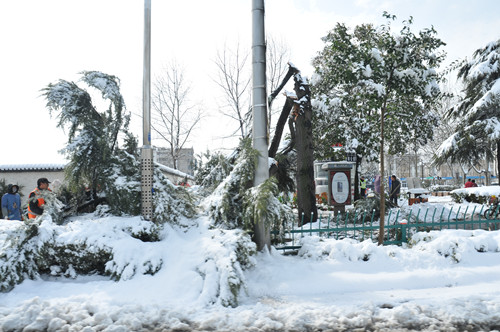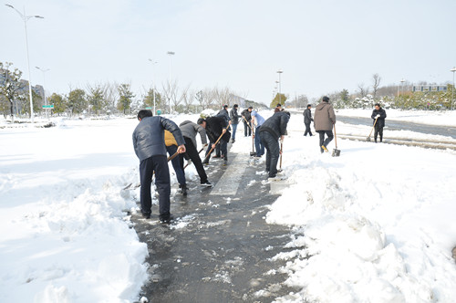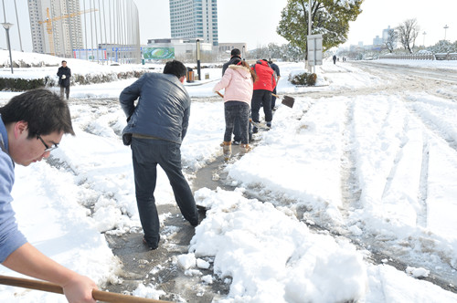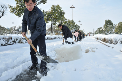 公司总部组织员工上路清扫积雪 时间:2013-02-19 4133 2月18日至19日凌晨,扬州出现低温降雪灾害天气,降下了多年罕见的一场大雪,压垮树枝和部分房屋设施,并造成道路交通不便。19日清晨,公司响应市政府号召,组织20余名员工上路清扫积雪,公司领导吴士茂、钱启明亲自参加,与大家共同会战2个多小时,完成了清扫任务。 厚重的积雪压垮树枝
