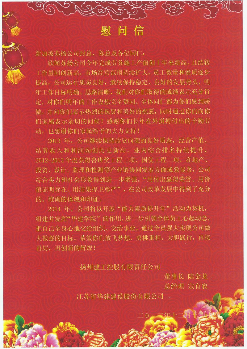 公司董事长、总经理发慰问信鼓励新加坡苏扬公司再接再厉 时间:2013-12-13 3540 12月中上旬,公司总部完成了对国内各区域公司的年终走访调研。新加坡苏扬公司则通过电子稿汇报了2013年工作情况及下年度工作思路。2013年新加坡苏扬公司主要经济指标创历史新高;队伍规模保持稳定;班组承包责任制成果显著;市场份额持续扩大。总部认为这一年来苏扬公司保质态,扩市场,稳增长,取得了不俗成绩,公司董事长陆金龙、总经理宗有农特发慰问信鼓励苏扬公司再接再厉,再创新高!慰问信全文如下:
