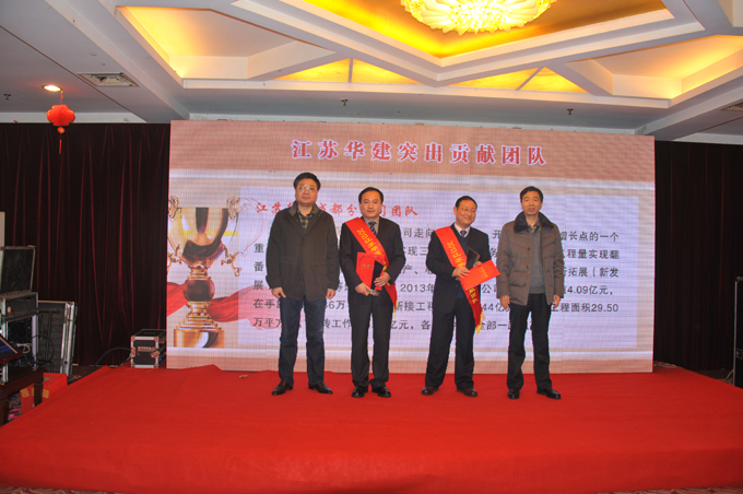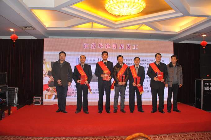 表彰会上,公司对2013年度表现突出的个人和团队进行了表彰, 34位员工获评“优秀员工”称号,朱靖、吕进、严正涛、朱旭生、陈明等5同志被表彰为“明星员工”,华建地产运河城市广场项目团队和江苏华建成都分公司团队被表彰为“突出贡献团队”。