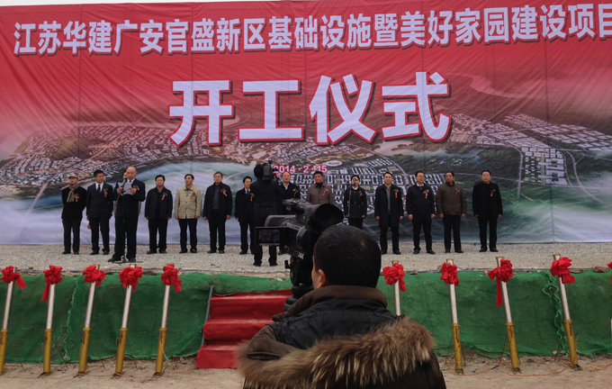 江苏华建广安官盛新区项目开工 时间:2014-02-17 4191 2月15日,江苏华建广安市官盛新区市政基础设施和美好家园项目举行开工建设仪式,公司副总经理、珠海公司总经理缪国枢出席仪式并发表致辞。广安区四套班子成员及相关部门负责人到场。 官盛新区按照产城一体理念,坚持集约、智能、绿色、低碳发展,同步规划建设产业园区和城市新区,力争把官盛新区建成功能完善、产业发达、人文丰厚、生态宜居的现代化新城。公司去年与官盛新区签署战略合作协议,决定投资30亿元参与广安官盛新区市政基础设施和美好家园建设,项目采取BT模式进行建设。