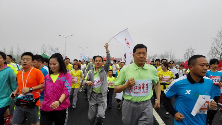 4月19日上午8点,由中国体育协会、江苏省体育局、扬州市政府共同主办的“中国声谷杯”2015扬州鉴真国际半程马拉松赛暨全国半程马拉松锦标赛正式鸣枪开赛。江苏华建爱跑团与来自全球43个国家和地区的3.5万选手共同冲出起跑线。