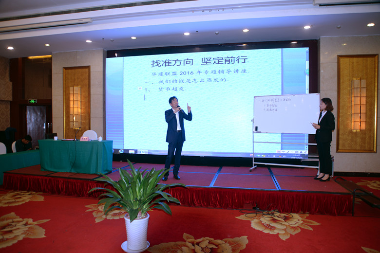 陆主席从过去建筑行业是平面思维,解的是一元一次方程,现在是立体思维,解的是三元三次方程引入,从货币超发、远离价值、抄底三个方面首先说明我们的钱是怎么蒸发的,从平民灭于P2P、中产灭于股市、土豪灭于信托高利债三个层次分析了钱没有了的三个通道。他说,过去是产品时代,现在是服务时代乃至是生活时代,以“九维”思维才能跟上时代的脚步。他从时间、空间、角度详细介绍了“九维”思维,“时间”是指过去、现在、未来,空间是指商业、事业、神业,角度是指我、你、他。未来决定过去和现在,懂得商业的人才懂得道,商业就是交换,透过商业上升到事业,进而达到神圣的事业。通过九维,我们才能明白当下经商需要的境界。当前的行业势已经介于C点与D点之间,开始下坡路,产品势必须有超前意识才有竞争力,团队势必须解决动力和阻力的问题,动力就是食、性、爱,阻力就是恐惧和惰性,处于上升势的团队才有战斗力。他强调说,联盟合作必须遵循三个法则:鱼缸法则、空灵法则、同频法则。鱼缸法则就是要扩大生存空间,空灵法则就是在新常态新业态下要有新的玩法,做好“四个删除”:删除混浊进入纯洁、删除外围进入核心、删除脑进入心、删除疲惫进入放松,同频法则就是要境界提升、思维提升、价值提升才能达到同频。陆主席说,文化绝对认同、能量必须匹配、持续智慧成长、走向合伙创业,是联盟合作的基础。他认为,民营企业怎么干就是要不设限、无边无际,三大要素就是:你干的事是刚需的、供应链金融、联盟。当前信用缺失的社会更需要契约精神。陆主席启发大家,学习的意义是引发新的思维和方向,并让自己深度思考和觉悟,进而改变自己未来的命运。学习的通道是读万卷书、行万里路、高人指路、阅人无数、自己顿悟,最终都不如直接进入,即从体验入、与实相合。他指出,民营企业家要为真人、做正事、会造场。当下经商(过渡时期)要经历三个时代:审判时代(2014—2016年)、觉醒时代(2017—2019年)、觉悟时代(2020—2022年)。时间是个神,能解决一切问题,罩见未来十年,是立体的动态的。早点觉醒,知道风口在哪,就知道未来怎么干。时代就像潮汐一样有高潮有低潮,有坚定之心、感恩之心、成长之心、担当之心就能赢得未来。贵族就是要有自由的灵魂、文化教养和社会担当。陆主席三元三次方程“九维”的精彩讲座打开了企业家的思维,为开创未来奠定了坚实的思想基础。