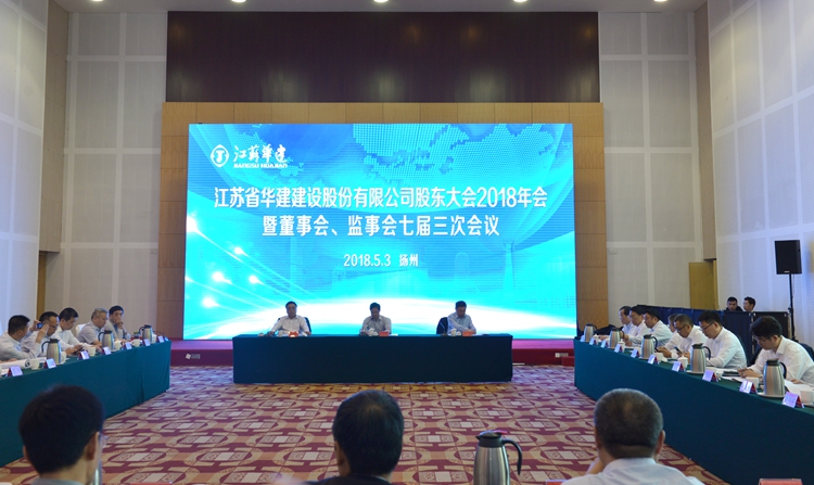 5月3日下午,江苏华建股东大会2018年会暨董事会监事会七届三次会议在扬州召开。公司股东单位代表和董事、监事出席会议,公司高级管理人员、各分支机构和总部各部室负责人、律师团律师列席会议,王宏董事长主持会议,扬州市政府副秘书长林宝荣出席会议并致辞。