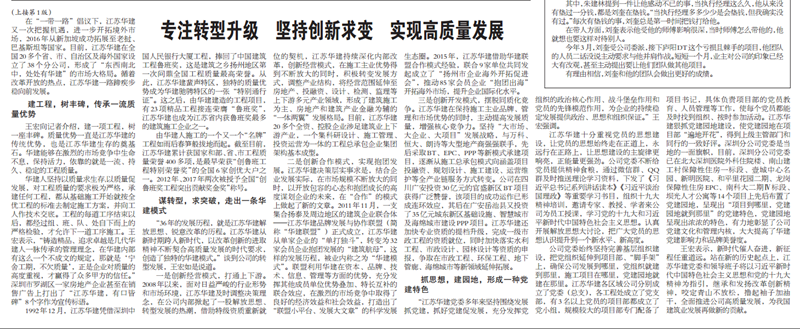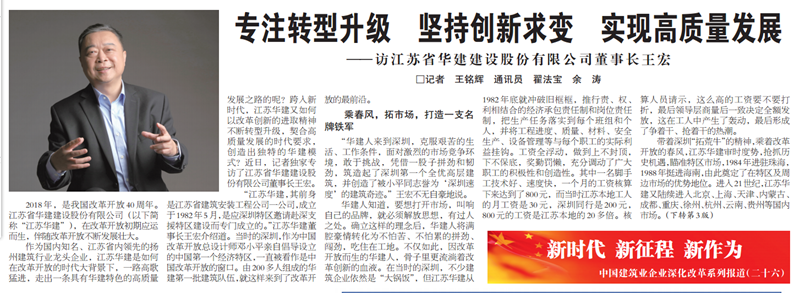 王宏董事长接受《建筑时报》专访:专注转型升级,坚持创新求变,实现高质量发展 时间:2018-09-11 4102 9月10日,《建筑时报》头版及微信公众号对王宏董事长的专访给予了刊载。 王宏董事长在专访中就江苏华建成立36年来,是如何在改革开放的时代大背景下,走出一条具有华建特色的高质量发展之路,跨入新时代,江苏华建又是如何以改革创新的进取精神不断转型升级,契合高质量发展的时代要求,创造出独特的华建模式进行了详细介绍。