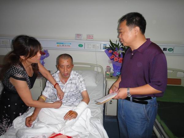 713上午,江苏华建副总经理、宜昌市扬州商会会长王宏、宜昌分公司总经理吕进、第一工程处主任唐生健等一行,前往市二医院看望香格里拉小区保安——英雄付永喜,并给他送去了慰问金。