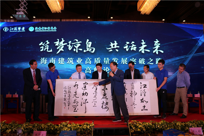 论坛上,原海南省委常委、宣传部长、国家行政学院原副院长周文彰欣然为江苏华建进琼三十周年赋诗题字:“江淮沃土育神兵,苏北班输天下行。华丽楼群基石上,建功汗水亮晶莹”。