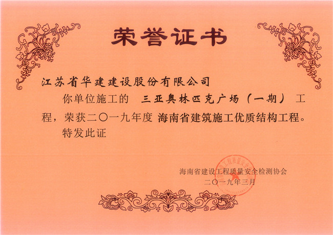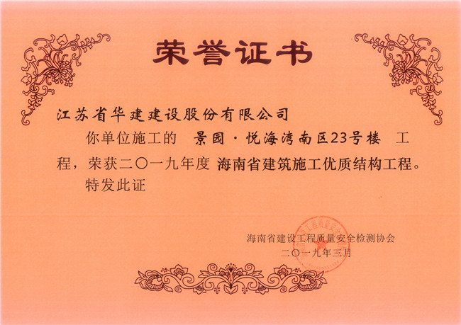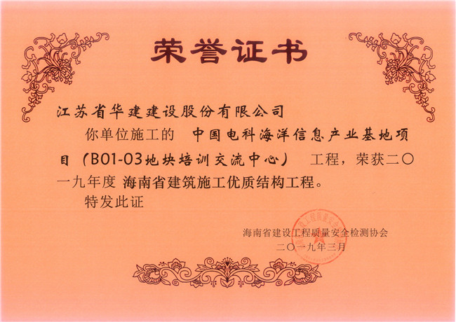 近日,海南省建设工程质量安全监测协会发文表彰了一批2019年度上半年海南省建筑施工优质结构工程,江苏华建海南分公司承建的3个项目上榜,分别是:三亚奥林匹克广场项目、中国电科海洋信息产业基地项目(B01-03地块培训交流中心)项目、景园悦海湾二期南区23#楼项目。