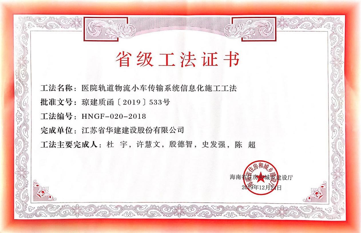 海南分公司新增1项省省级工法 时间:2020-01-10 3506 2019年12月24日,海南省住房和城乡建设厅公布了2018年度海南省省级工法评审结果,我司《医院轨道物流小车传输系统信息化施工工法》成功入选。