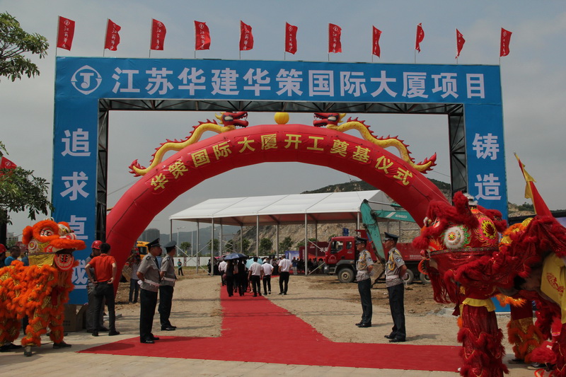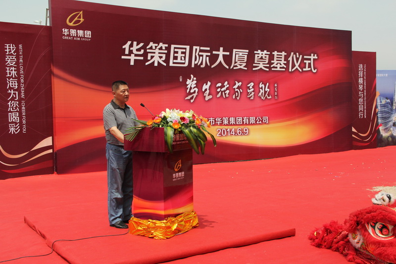 缪国枢总经理首先代表江苏华建陆金龙董事长、宗有农总经理和公司全体员工对华策国际大厦工程顺利奠基表示热烈的祝贺,同时在致辞中表示:江苏华建在特区成立之初就来到珠海,30年的历程中跟随珠海特区的发展而逐步发展、壮大。在珠海经济特区成立30周年评选出的“十大知名建筑”中,有三项建筑是出自江苏华建人之手,我们华建人已经与珠海这片热土建立了深厚的感情。今天能够承建华策国际大厦工程,参与到珠海横琴新区的建设中来,我们既深感荣幸,也感到肩上沉甸甸的责任。华策国际大厦工程地理位置优越,建筑造型优美、华丽,极具视觉震撼力。建成后的华策国际大厦,将是横琴新区的地标性建筑之一,必将以其鲜明的建筑特色为横琴新区增光添彩!作为全国首批43家房屋建筑工程施工总承包特级资质企业之一,我们江苏华建有信心、有决心、有能力顺利完成本项目的施工任务,并以获得“鲁班奖”为本工程的质量目标。我们将与华策公司携手并肩,共同努力,在政府主管部门的支持、指导下,将本工程打造成一项夺目的建筑艺术品,为珠海横琴新区建设贡献力量!