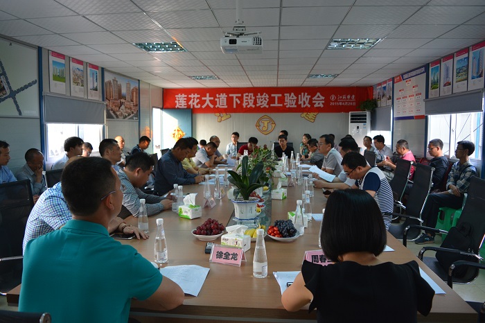 本次验收共分四个验收组,即景观工程验收组、道路工程验收组、照明、交通、通信及电力工程验收组、排水及桥涵工程验收工程验收组。验收会前四个验收组已分别进行了现场验收和资料检查,对检查情况进行了点评汇总。参会领导及其他建设行政主管部门代表还步行参观了莲花大道下段及官盛春天安置房项目1#楼封顶现场。