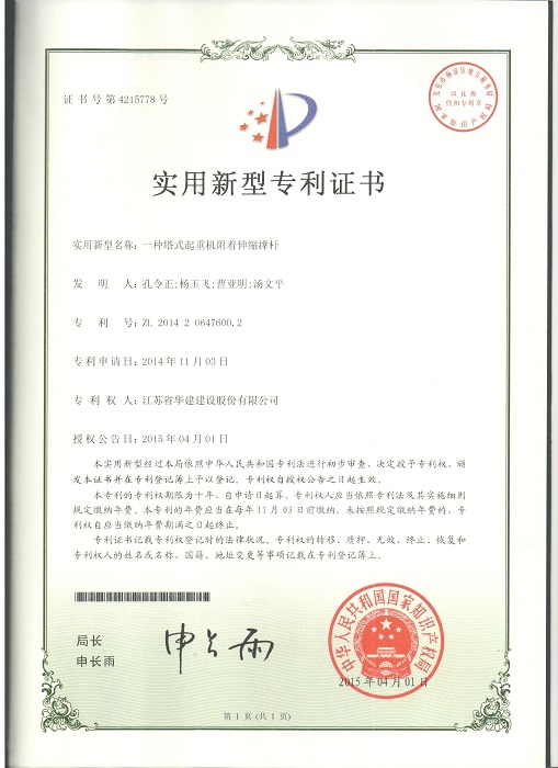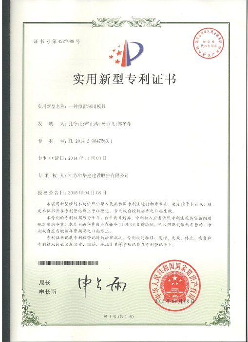 三项实用新型成果分别是:1、《一种预留洞用模具》(专利号:ZL201420647560.1,专利权人:孔令正、严正涛、杨玉飞、郭冬冬);2、《一种型钢混凝土的模板支撑结构》(专利号:ZL201420647633.7,专利权人:孔令正、杨玉飞、曹亚明、郭冬冬);3、《一种塔式起重机附着伸缩撑杆》(专利号:ZL201420647600.2,专利权人:孔令正、杨玉飞、曹亚明、汤文平)。