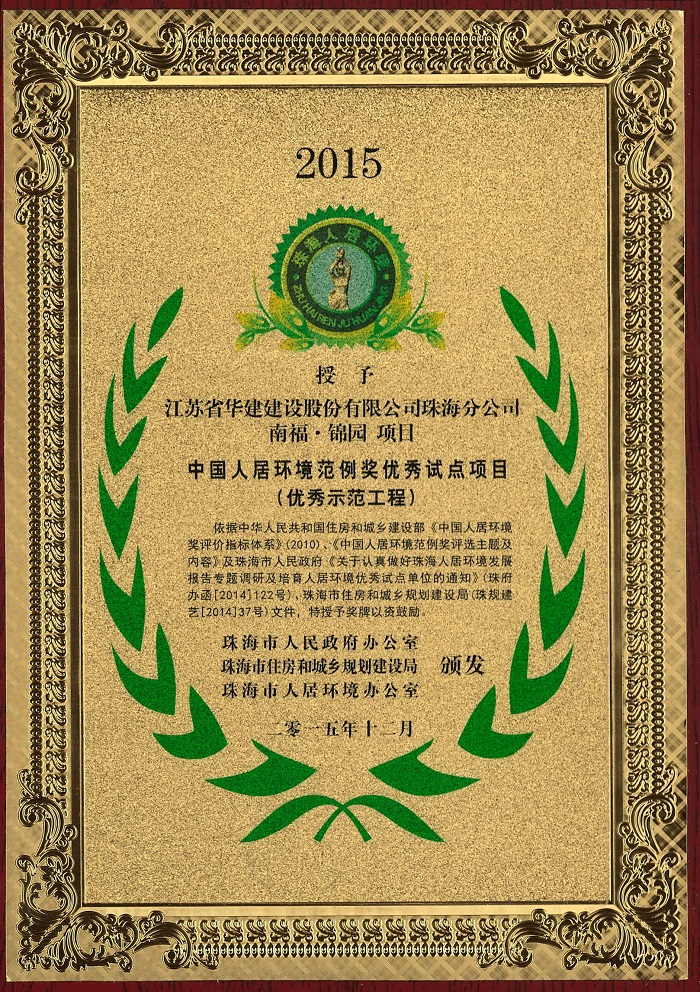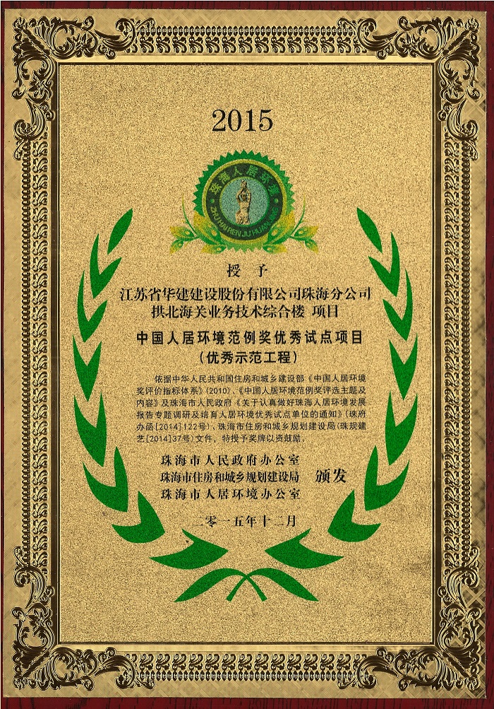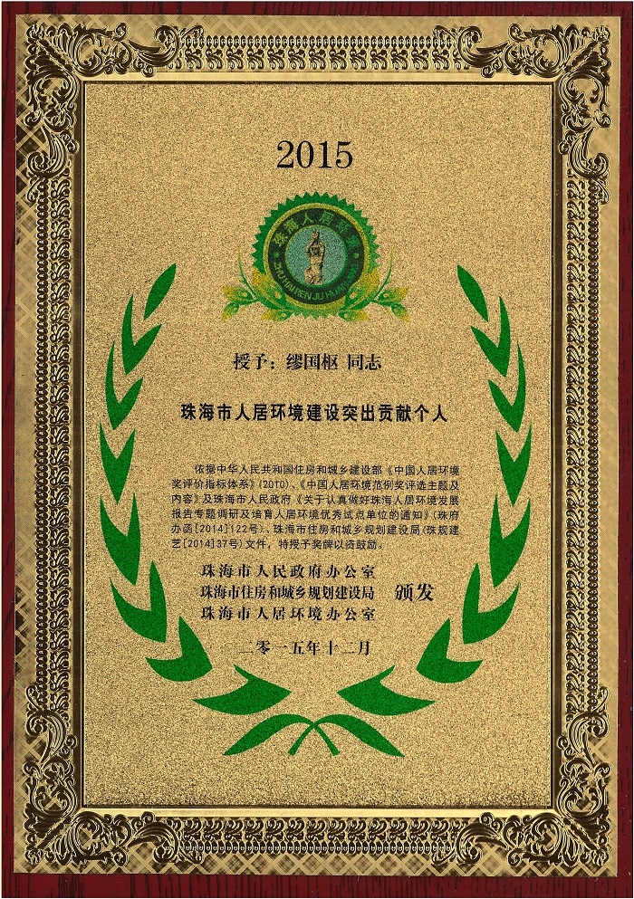 公司荣获珠海市人居环境建设突出贡献单位等四项表彰 时间:2015-12-22 4196 近日,珠海公司被珠海市人民政府办公室、珠海市住房和城乡规划建设局和珠海市人居环境办公室联合表彰为珠海市人居环境建设突出贡献单位(优秀建筑施工企业),缪国枢总经理被授予珠海市人居环境建设突出贡献个人称号,由我公司承建的拱北海关业务技术综合楼及南福·锦园项目荣获中国人居环境范例奖优秀试点项目(优秀示范工程)。