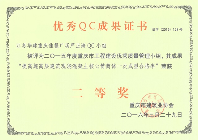 公司新增2项省级QC成果 时间:2016-04-06 3990 近日,重庆市建筑业协会发文表彰了一批优秀QC成果,公司重庆佳程广场项目严正涛、沈正祥QC小组被评为2015年度重庆市工程建设优秀质量管理小组,其成果“提高超高层建筑现浇混凝土核心筒筒体一次成型合格率”、“提高钢筋机械套筒连接合格率”等均荣获二等奖。