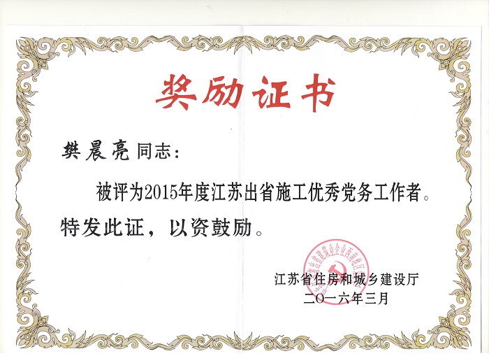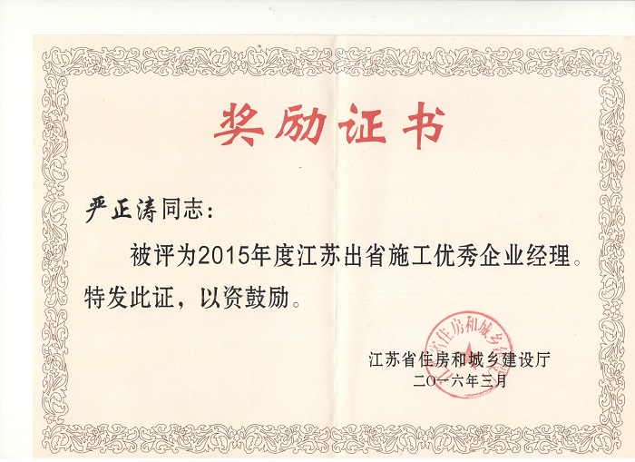重庆分公司被表彰为“2015年度江苏出省施工先进企业” 时间:2016-04-20 2888 近日,重庆分公司被江苏省住房和城乡建设厅表彰为“2015年度江苏出省施工先进企业”,重庆分公司总经理严正涛荣获“2015年度江苏出省施工优秀企业经理”称号,樊晨亮被评为“2015年度出省施工优秀党务工作者”。