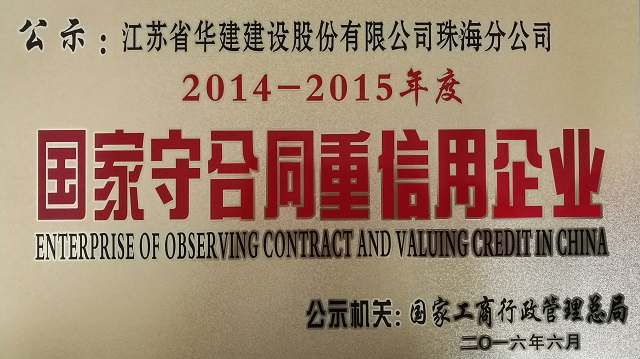 公司荣获国家级“守合同重信用”企业称号 时间:2016-08-02 2729 日前,国家工商行政管理总局向社会公示2014-2015年度“守合同重信用”企业名单,珠海公司荣获国家级“守合同重信用”企业称号。 珠海市共计13家企业被国家工商总局表彰为2014-2015年度“守合同重信用”企业,其中新上榜企业4家。荣获该称号充分展现出江苏华建在珠海市场守法履约的良好施工企业形象。