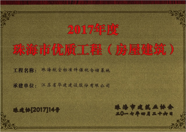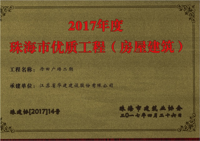 公司2项目获评珠海市房屋建筑优质工程 时间:2017-05-16 3662 近日,珠海市建筑业协会发文公布2017年度珠海市优质工程名单,我司承建的珠海航空标准件保税仓储基地和丹田广场二期的2个项目榜上有名。