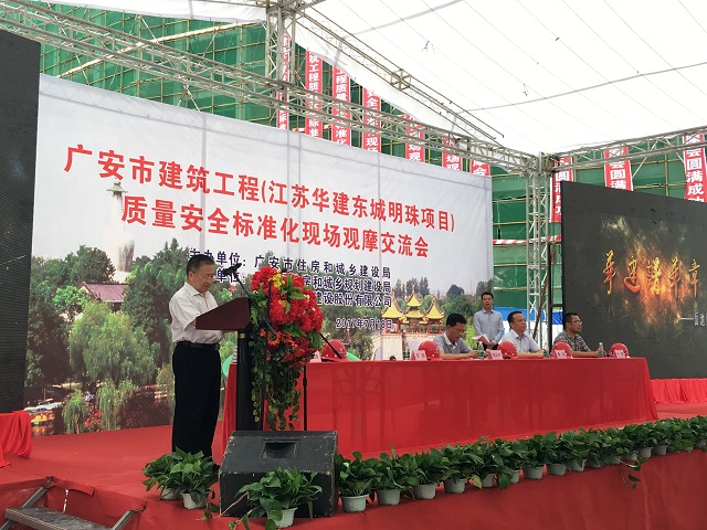 7月18日上午,广安市2017年建筑工程质量安全标准化施工现场观摩会在我司东城明珠项目召开,广安市住建局总工程师刘运举、岳池县副县长杨伟和公司总部领导程杰、吴士茂、重庆分公司总经理严正涛、副总经理庞文荣、田大浪等参加会议。