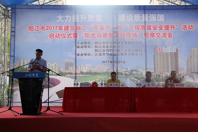 珠海区域公司总经理吕方达出席会议并发言。吕总在发言中指出,江苏华建自进入阳江市场以来一直秉承“质量兴企”的基本理念,高度重视质量管理工作,在阳江市场树立了良好的口碑。阳光马德里二期56-61栋项目在决策前期就先确立高起点的质量创优目标,在施工过程中严格执行各项流程、制度,通过宣传、培训、确立奖罚目标等方式在项目部内部创造了良好的创优氛围。同时加大对新型绿色施工技术、新材料、新工法的创新投入,主体结构采用铝模技术施工,创造了3天一层的阳江建设新速度。吕总表示,本次活动放在我们施工现场举行,既是对江苏华建的信任,更是一种鞭策!今后将一如既往地继续重视质量管理工作,多创精品工程,不辜负阳江市住建局和广大业主的信任、支持,力争在质量创优、技术创新方面取得更多、更好的成绩!