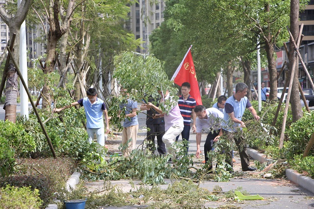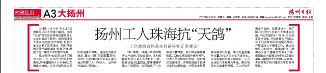 8月23日,珠海遭遇了53年来最强台风“天鸽”,全市受灾严重。台风过后,珠海公司第一时间迅速组织复产自救工作,并主动联系珠海有关部门,迅速组织志愿者及重型工程车辆投入到社会道路的清理中去。在这场抗风救灾的战斗中,珠海公司共疏通社区道路5条、市政道路3 条,清走倒伏大树200余棵,运送灾后垃圾 20车次。《扬州日报》A3版显著位置对公司抗风救灾活动进行了报道,点评江苏华建珠海公司“众志成城,生产自救,展现了扬州建筑大军的良好形象”。