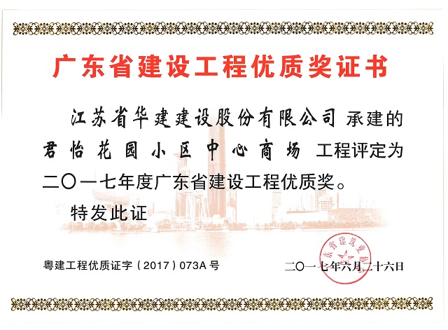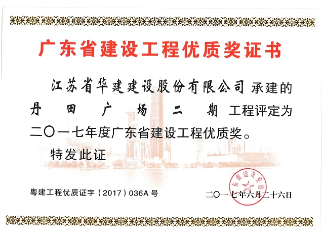 公司荣获三项2017年度广东省建设工程优质奖 时间:2017-10-17 3383 近日,广东省建筑业协会发文公布2017年度广东省建设工程优质奖名单,我司承建的珠海航空标准件保税仓储基地、丹田广场二期和君怡花园小区中心商场3个项目榜上有名。