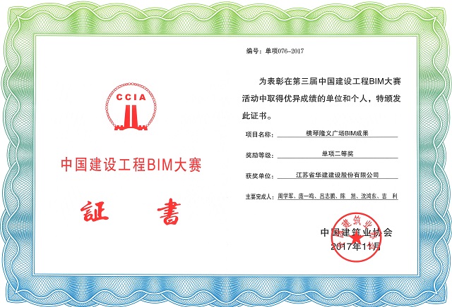 12月20日,由中国建筑业协会主办的第三届中国建设工程BIM大赛结果正式公布,江苏华建珠海公司申报的《横琴隆义广场BIM成果》获得单项组二等奖。