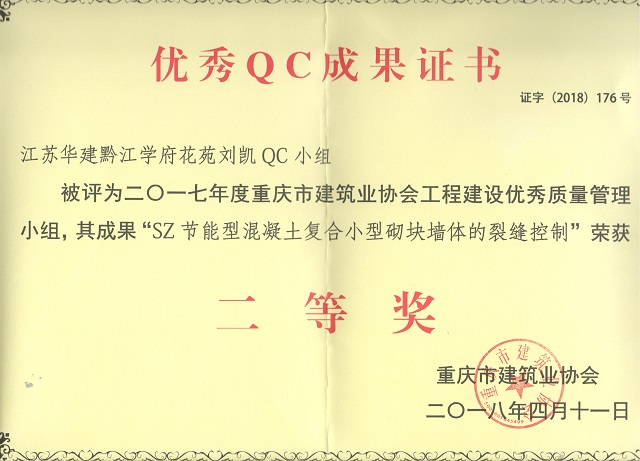 近日,重庆市建筑业协会发文表彰了一批优秀QC成果,江苏华建黔江学府花苑刘凯QC小组被评为2017年度重庆市工程建设优秀质量管理小组,其成果“SZ节能型混凝土复合小型砌块墙体的裂缝控制”荣获二等奖。