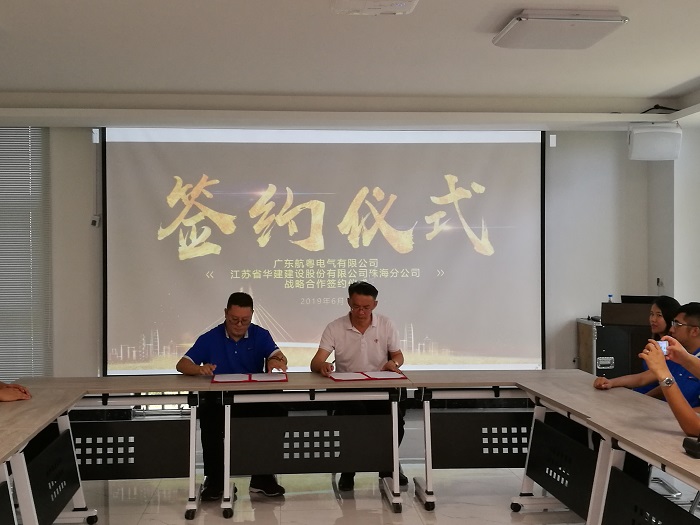 2019年6月15日,江苏华建珠海分公司总经理吕方达与广东航粤电气有限公司董事长杨建丰分别代表双方签订《战略合作框架协议》。