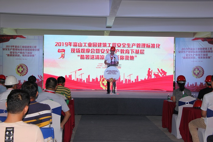 7月8日下午,2019年富山工业园建筑工程安全生产管理标准化现场观摩会暨安全生产教育下基层“酷暑送清凉、情系你我他”活动在公司承建的通得电气富山工业园项目现场隆重举行。富山工业园开发建设局局长霍咏梅,珠海市建筑安全协会秘书长张丽,珠海市建筑安全职业技能培训学校校长江春华,江苏华建珠海区域公司总经理吕方达,以及富山工业园区管委会工作人员、建设单位、监理单位、施工单位等200余人参加。