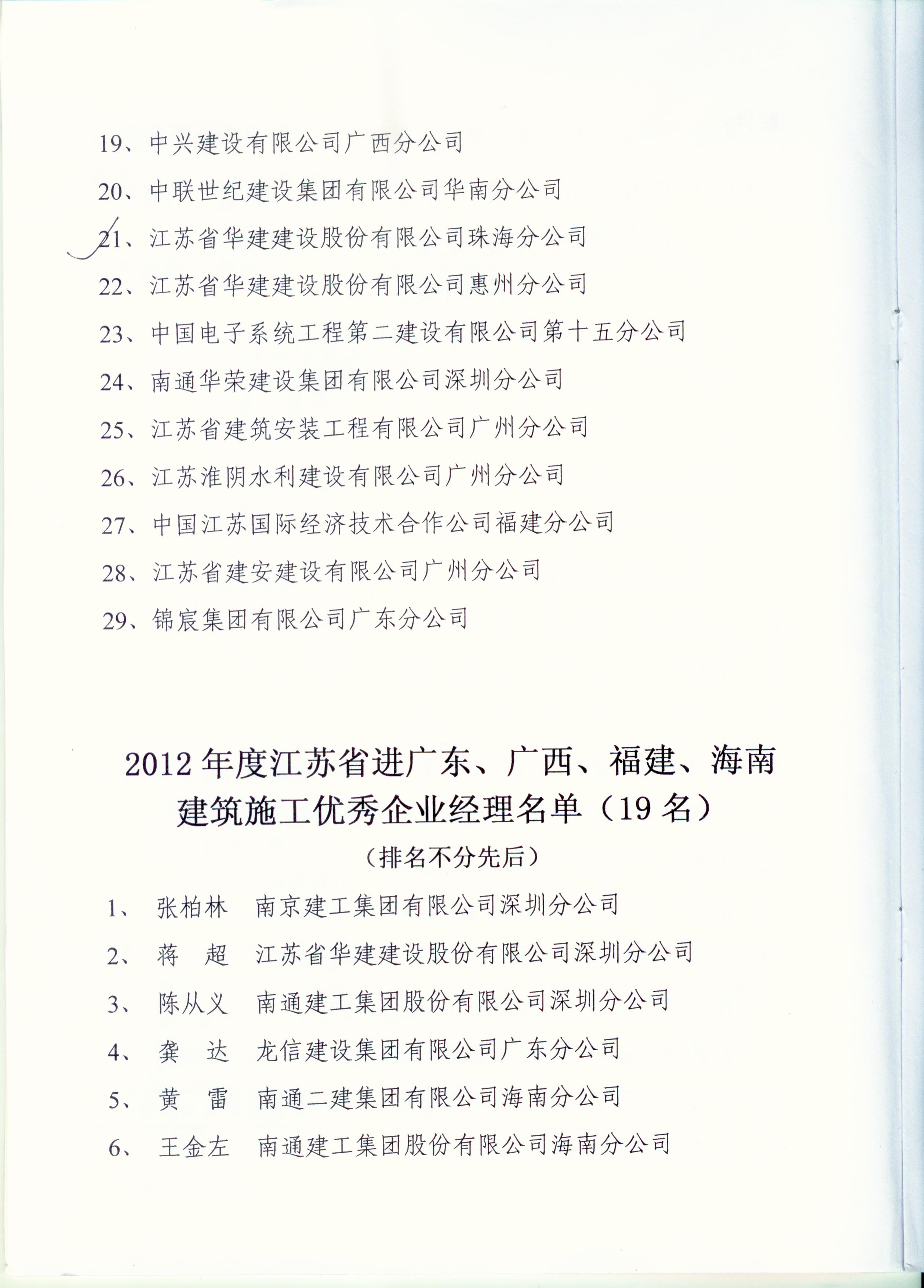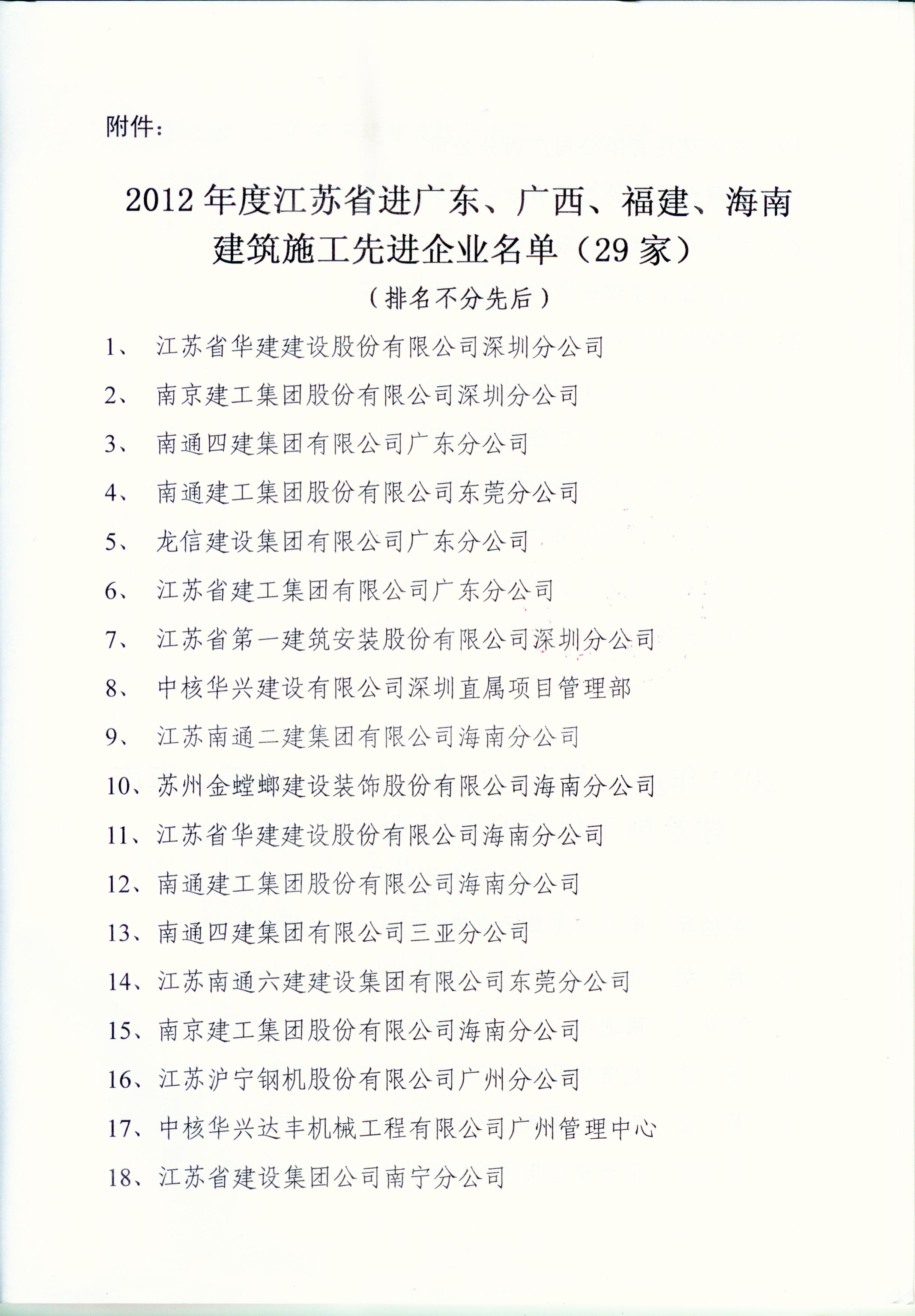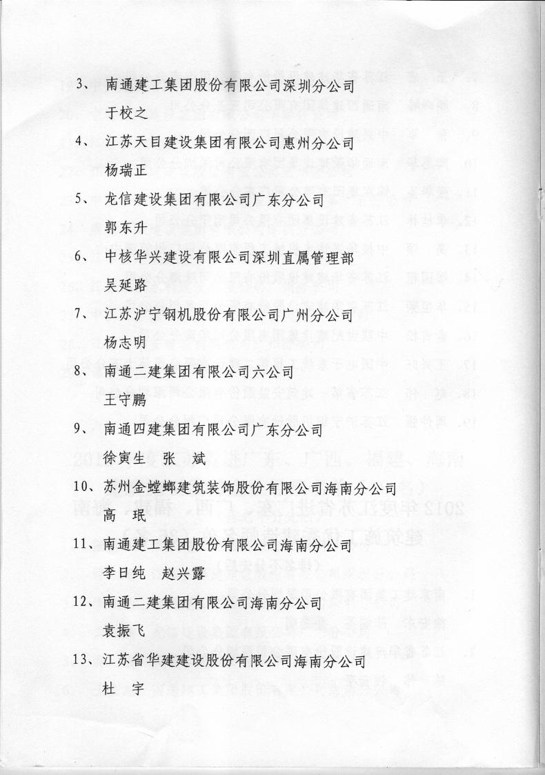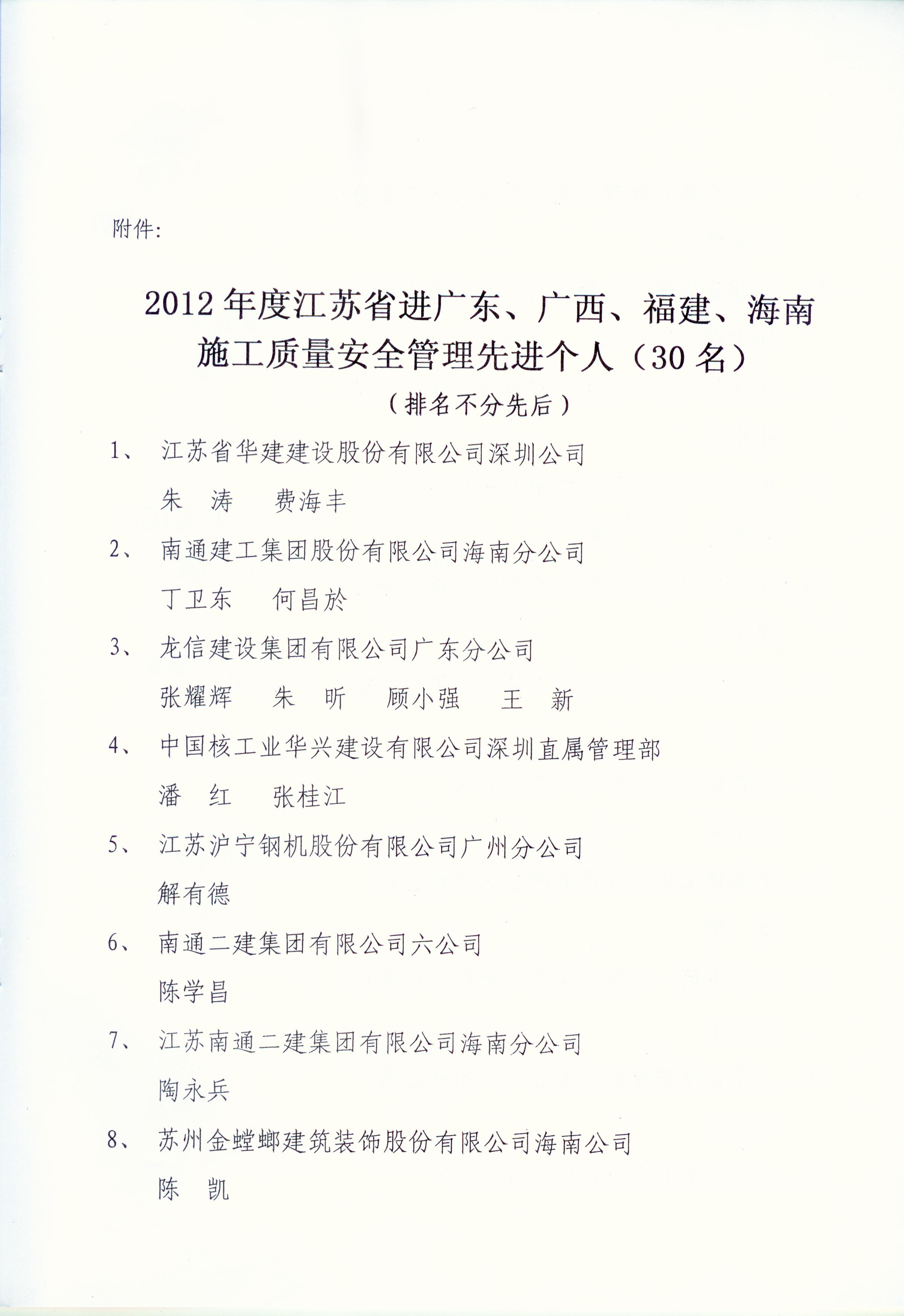 2012年江苏进粤、桂、闽、琼建筑施工先进企业、优秀企业经理、优秀建造师及经营财务管理、质量安全管理先进个人