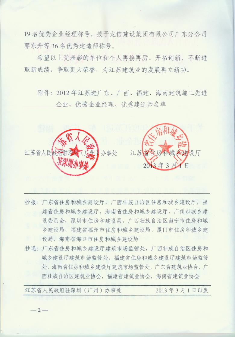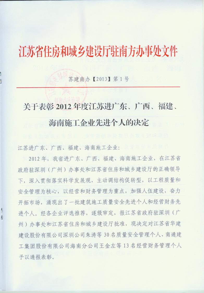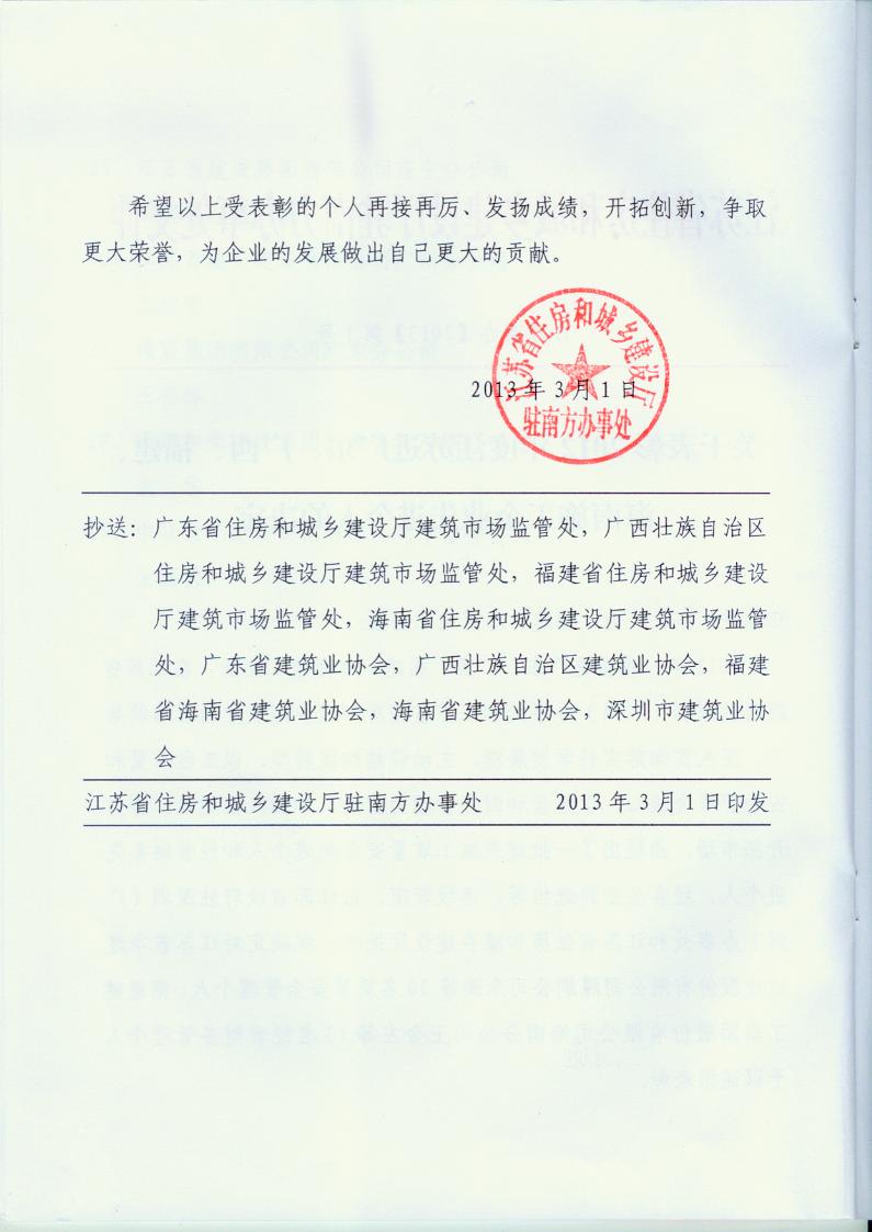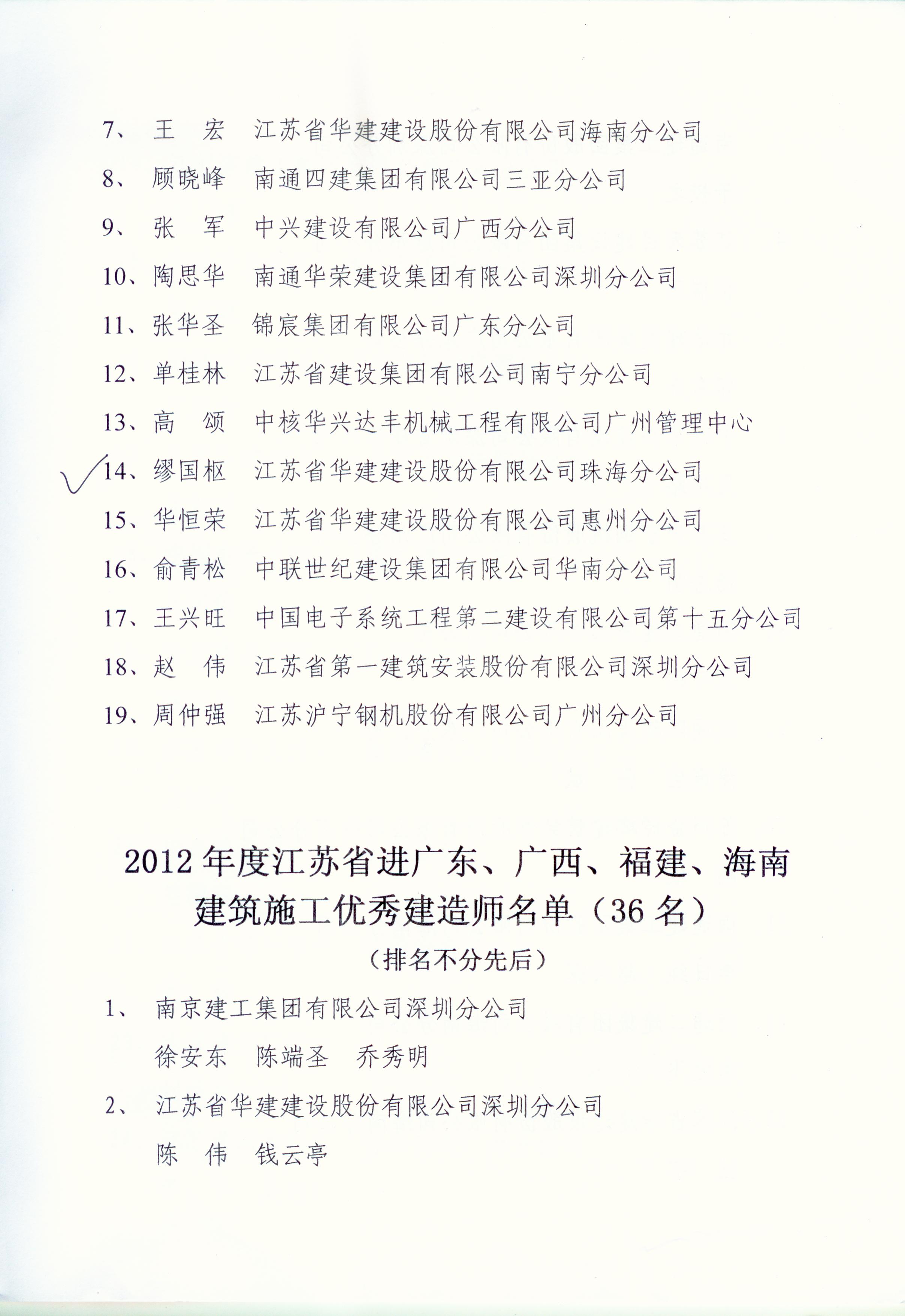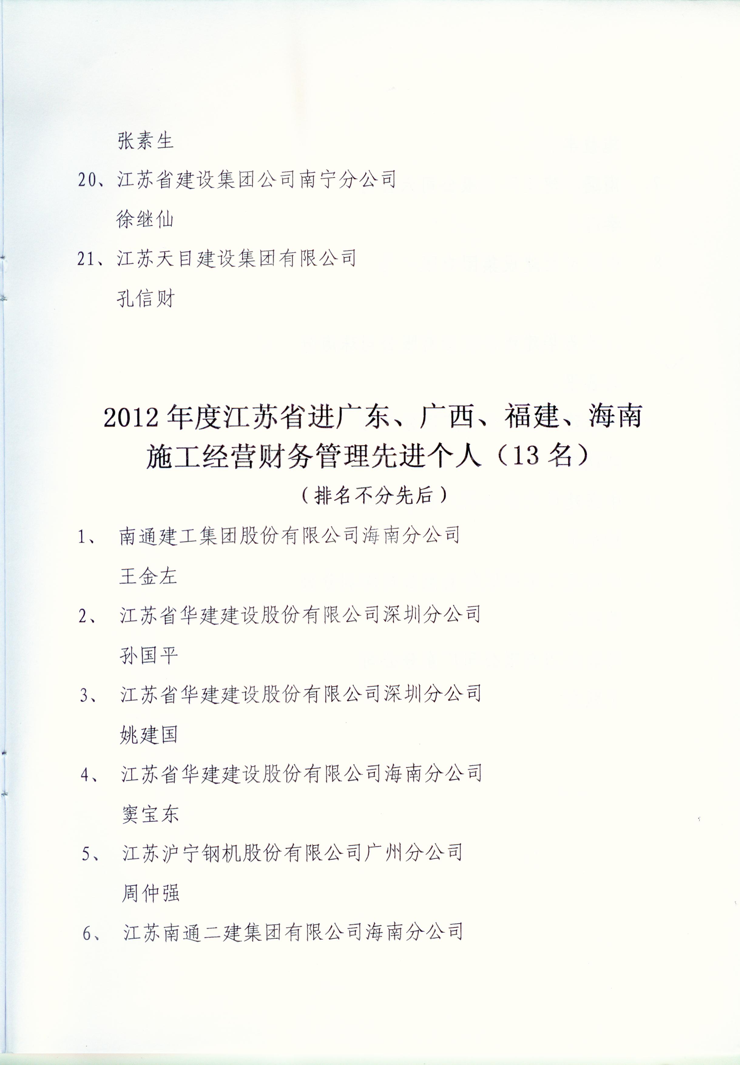 2012年江苏进粤、桂、闽、琼建筑施工先进企业、优秀企业经理、优秀建造师及经营财务管理、质量安全管理先进个人