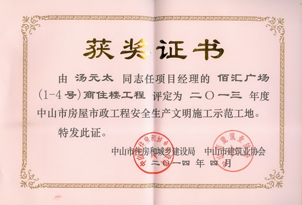 2013年度佰汇广场商住楼工程中山市房屋市政工程安全生产文明施工示范工地