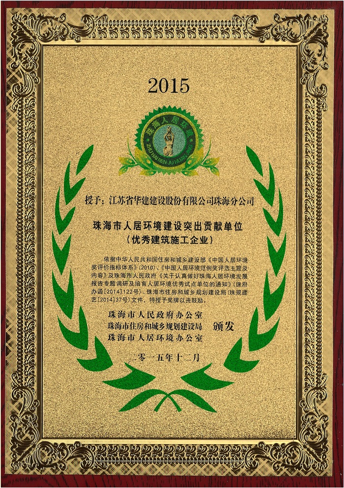 珠海市人居环境建设突出贡献单位(优秀建筑施工企业)