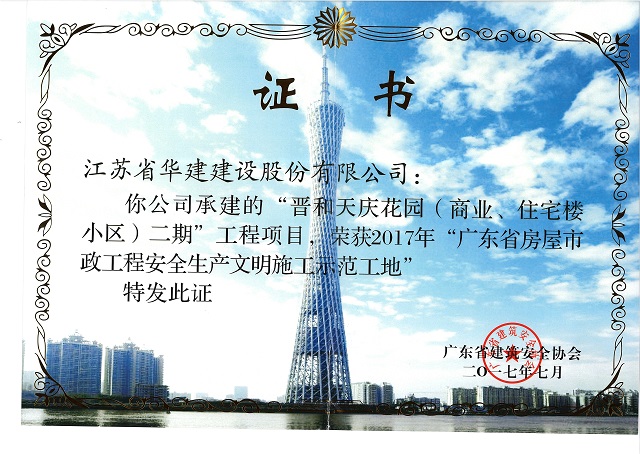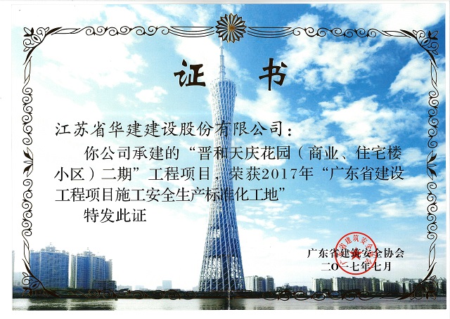 晋和天庆二期获2017年广东省建设工程项目施工安全生产标准化工地