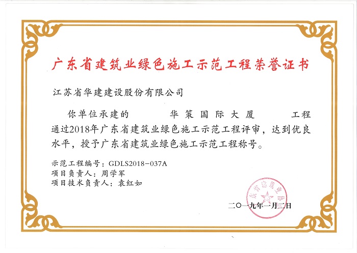 华策国际大厦获2018广东省建筑业绿色施工示范工程