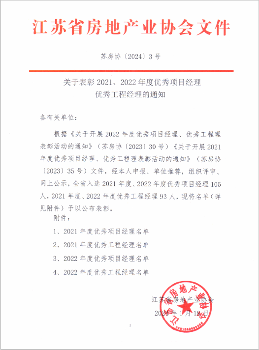 近日,江苏省房地产协会公布了《关于表彰2021、2022年度优秀项目经理、优秀工程经理的通...
