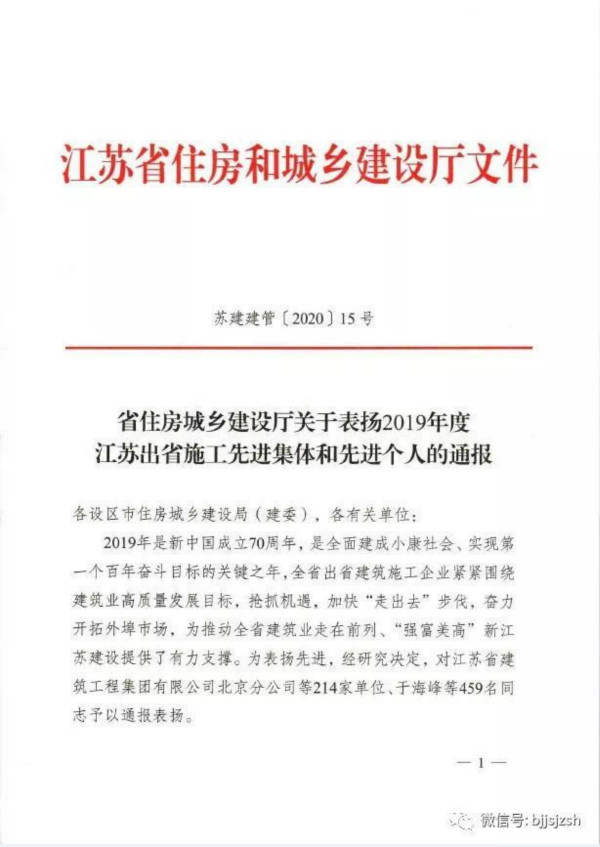 近日,江苏华建北京分公司被江苏省住建厅表彰为“2019年度出省建筑施工先进集体”。当前疫情...