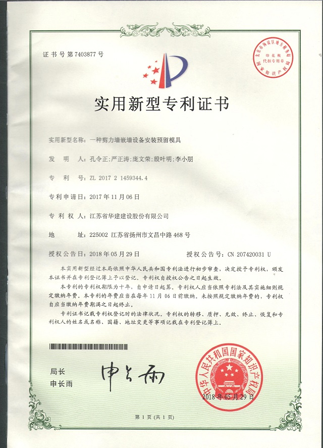 近日,从国家知识产权局传来喜讯,公司申请的《一种剪力墙嵌墙设备安装预留模具》获得实用新型专...