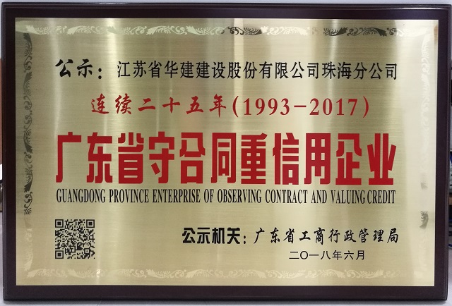 近日,珠海公司被广东省工商行政管理局授予“连续二十五年守合同重信用企业”荣誉称号。